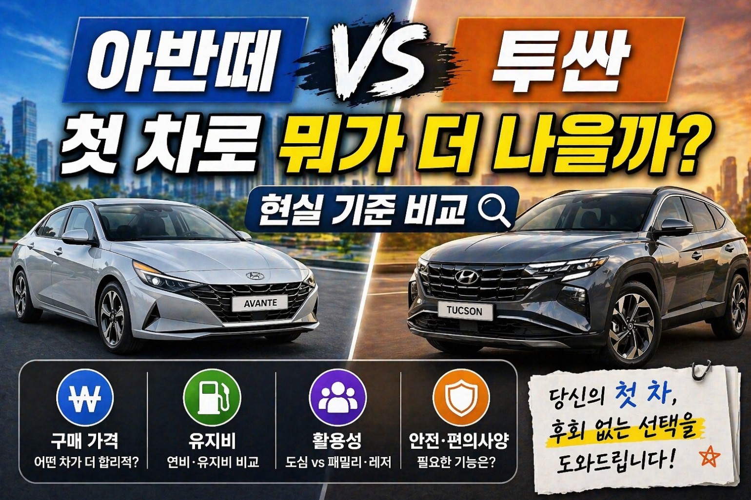 이 글에서는 첫 차 기준으로 아반떼와 투싼을 유지비, 사용 환경, 그리고 실제 만족도 관점에서 비교해 보고 어떤 선택이 더 현실적인지 정리해보려고 한다.