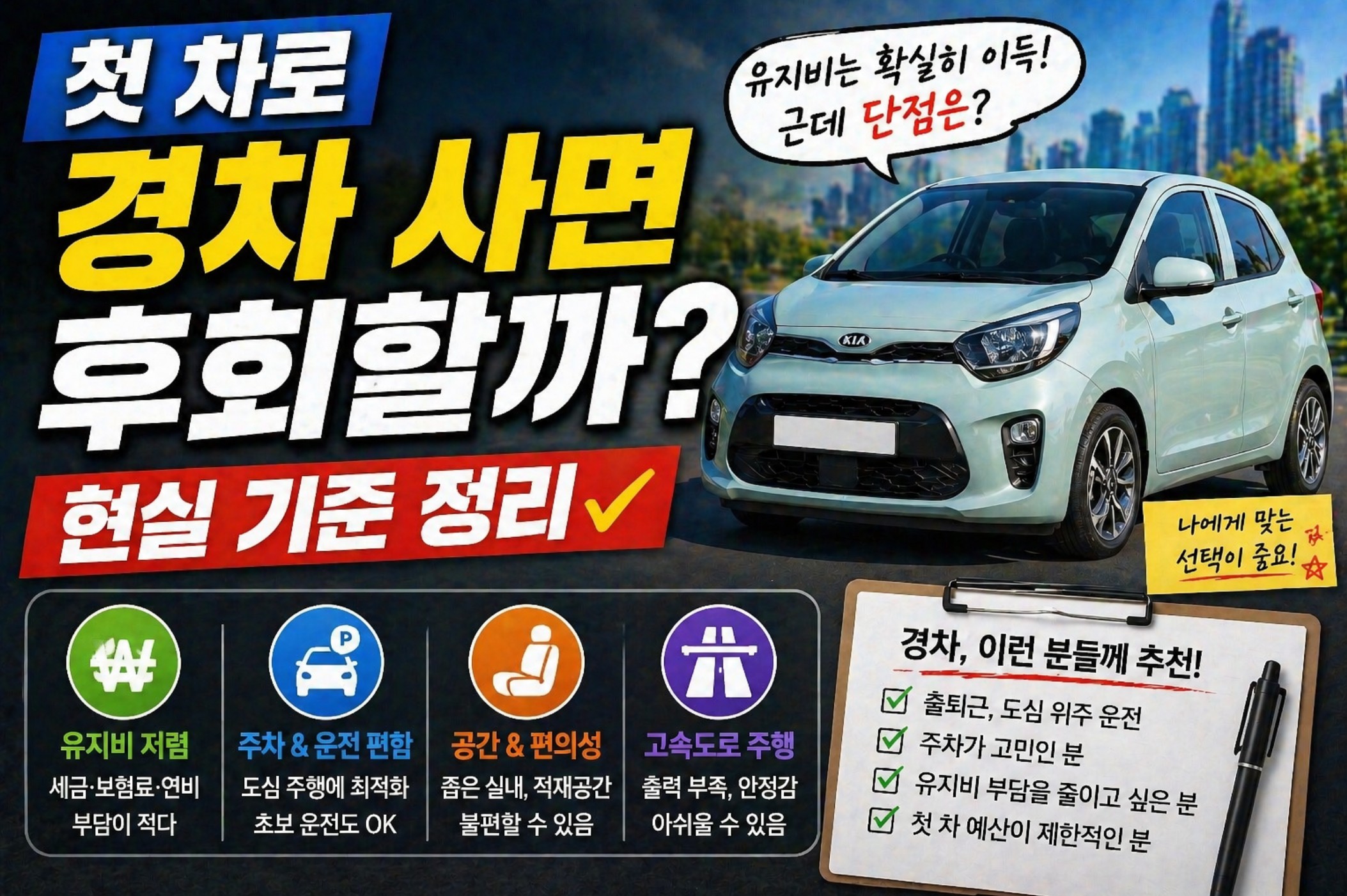 첫 차는 완벽한 선택을 하는 것보다, 나에게 맞는 선택을 하는 것이 더 중요하다. 이 기준만 명확하게 잡혀 있다면 경차를 선택하더라도 후회할 가능성은 크게 줄어든다.
