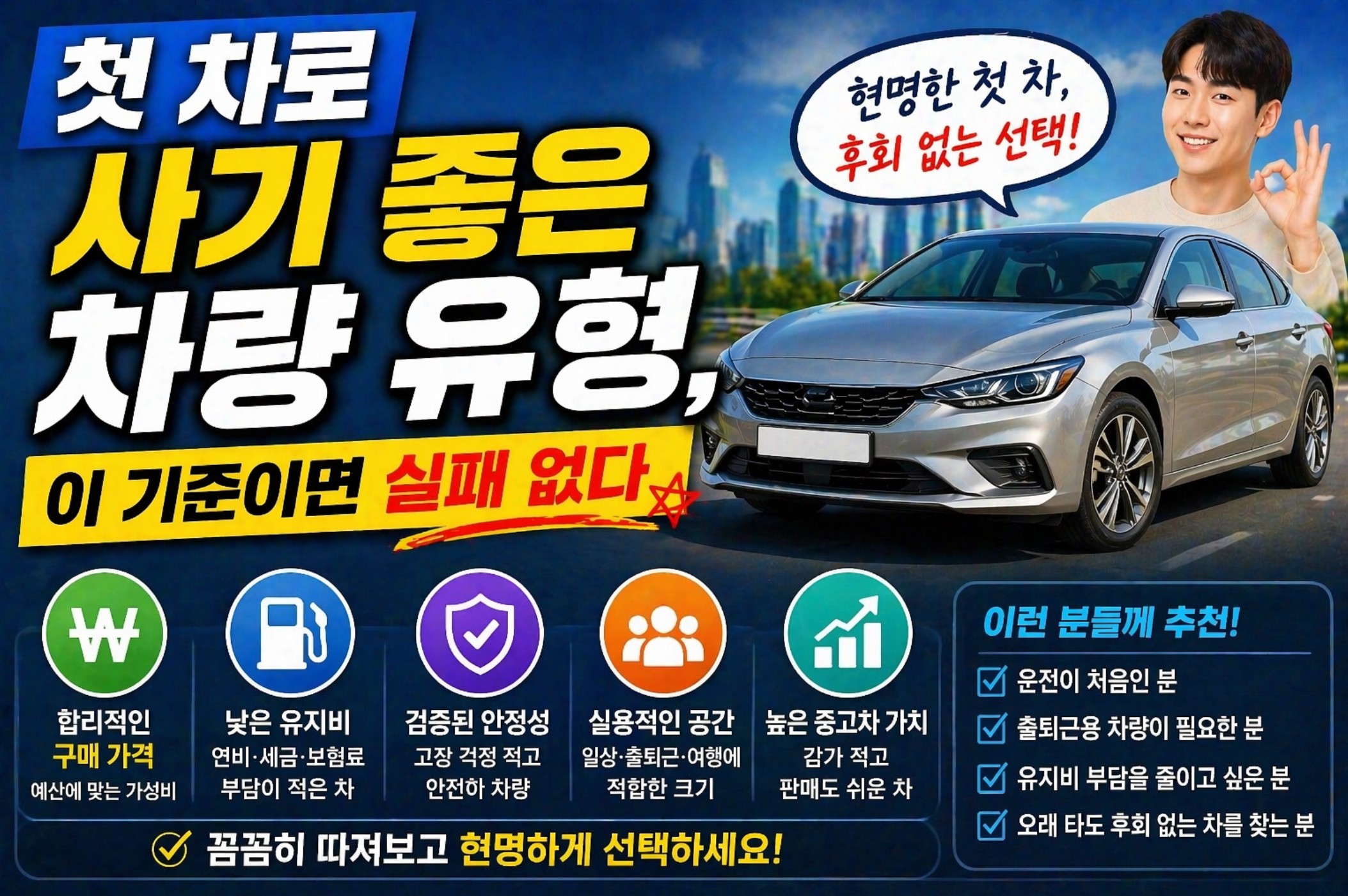 결국 첫 차는 “좋아 보이는 차”가 아니라 “계속 탈 수 있는 차”를 선택해야 한다. 부담 없는 가격, 유지하기 쉬운 구조, 검증된 안정성, 그리고 실생활에서 불편하지 않은 공간까지 이 기준이 맞춰져야 장기적으로 만족도가 높아진다.